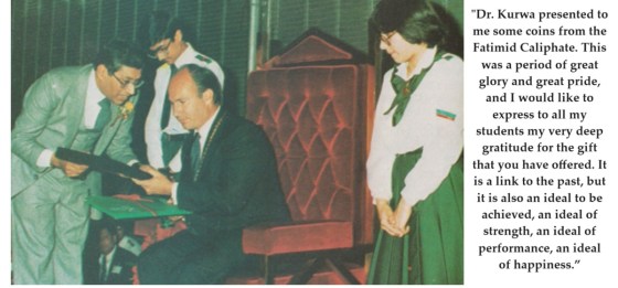 “Dr. Kurwa earlier, presented to me some coins from the Fatimid Caliphate. This was a period of great glory and great pride, and I would like to express to all my students my very deep gratitude for the gift that you have offered. It is a link to the past, but it is also an ideal to be achieved, an ideal of strength, an ideal of performance, an ideal of happiness.” (Excerpt from Ilm, Volume 4, Number 3).