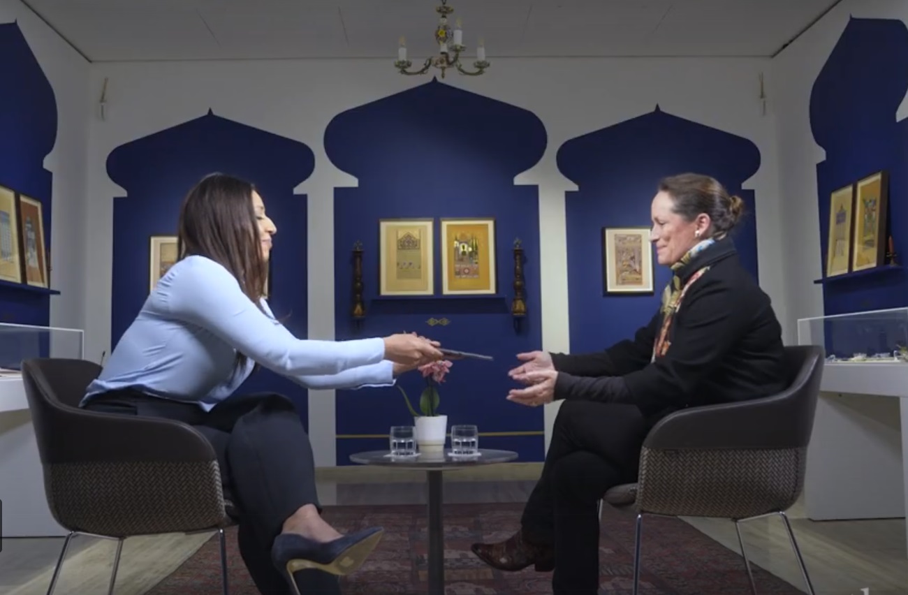 Farah Nasser hands Princess Zahra Aga Khan a Tablet, requesting that she watch a 1994 clip from a Farman delivered by Mawlana Hazar Imam to the UK Jamat gathered in London. Photograph: Still photo from interview.