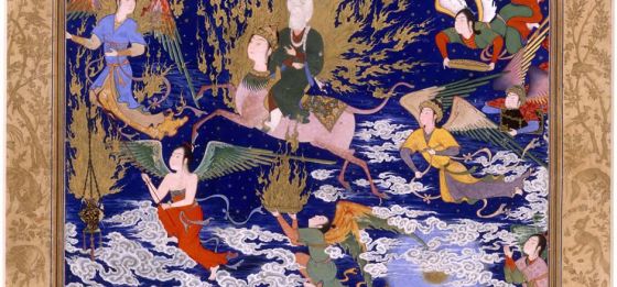 Fragment from a manuscript of Bustan of Sadi extolling the Prophet’s miraculous ascension to the heavens (mi’raj) Image: Wikipedia. Please click for article.
