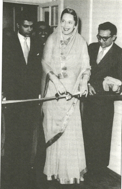 The Begum Aga Khan, Mata Salamat, performing the opening ceremony of the Ismailia Social and Resdiential Club on 17th May, 1953. Seen in the picture are President Al Noor Kassum on left and Mukhi Tajdin Jiwan Hirji on right. Photo: Al Noor Kassum archives.