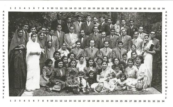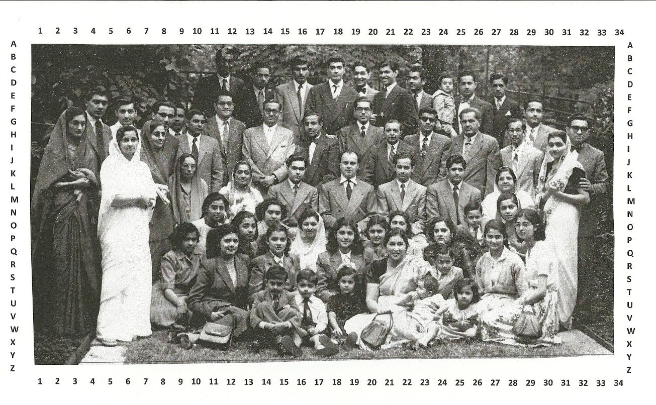 1952: The late Prince Aly Khan with the London Jamat gathering at Javeri residence at 39 Lyncroft Gardens, Hampstead, London NW5. Note: A number of people who feature in this picture are mentioned in the narrative below. For ease of recognition ‘grid reference’ numbers have been given for such persons when their names appear for the first time in the narrative. Example: Prince Aly Khan is at grid ref (J19). More than half the above people have been identified so far and their names are shown on a separate Jpg list provided below. Please click photo to enlarge.