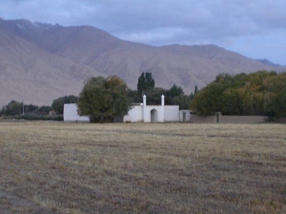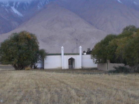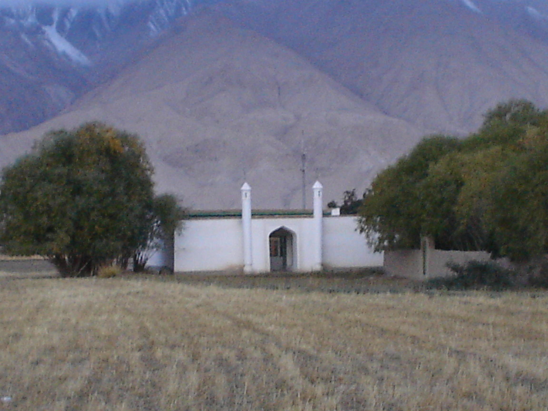 Tashkorgan Jamatkhana, China, is off the main highway leading in and out of the town in an open field with the mountains behind. Photo: Nuram. Copyright.