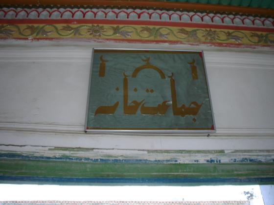 This sign at the entrance simply says “Jamatkhana” in a Persian script. Photo: Nuram. Copyright. Please click this photo for enlargement.
