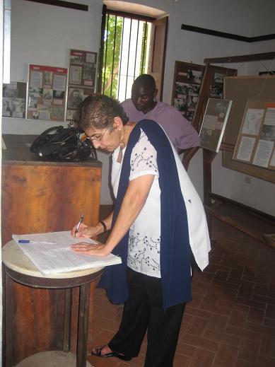 Shariffa Keshavjee signing the guest book at the Bagamoyo Museum. Photo: Shariffa Keshavjee, Nairobi, Kenya. Copyright.