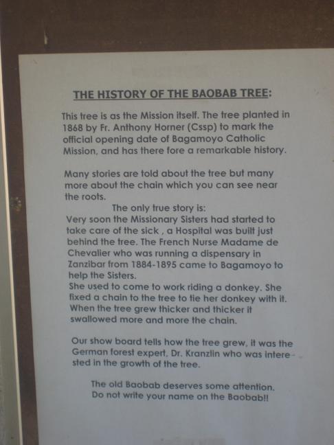 A history of the famous Baobab Tree in Bagamoyo. The tree was planted in 1868 and has therefore a remarkable history.  Photo: Shariffa Keshavjee, Nairobi, Kenya.