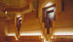 This inner-most sanctuary is designed to create a contemplative environment. It is square in plan, and double-storey in height. Panels of sandblasted coral and rose marble inlaid with brass create the Mihrab (niche indicating the direction of prayer). The walls are still concrete, but again, softened by a base wall of solid oak inlaid with brass. There is adequate but very gentle incandescent lighting, mostly hidden behind the oak base walls. There are four windows in the entire prayer room, designed to look like oil lanterns.
